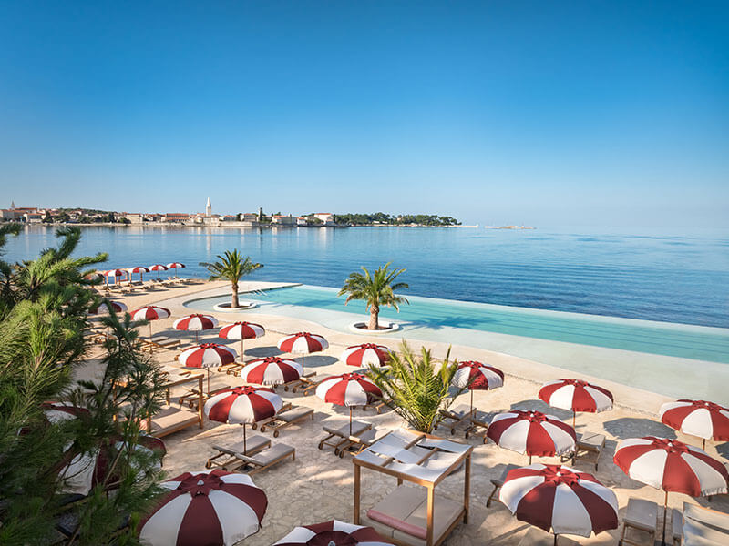 Relaxujte na naší dlážděné pláži s kompletními službami, infinity bazénem, výhledem na Poreč a odpoledními vystoupeními DJ u bazénu.